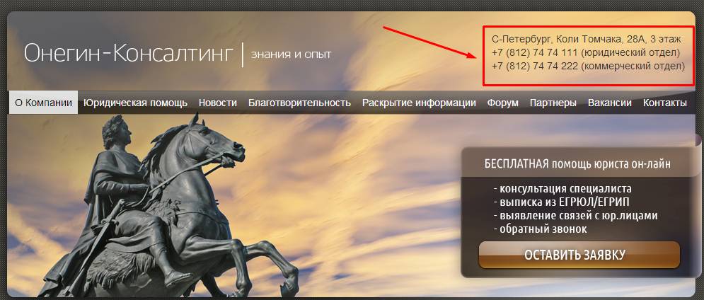 Адрес компании и контактные телефоны необходимо размещать на самом видном для пользователя месте, и лучше сделать так, чтобы на всех страницах сайта это информация присутствовала (рис. 13). Нужно это для того, чтобы пользователь не обременял себя поиском твоих контактов, а мог к ним обратиться при малейшем желании. Ведь это обращение так важно для тебя, потому что в перспективе его можно перевести в реальные деньги. Хорошо, если твои телефоны будут простыми и легко запоминающимися – так называемые «красивые номера».