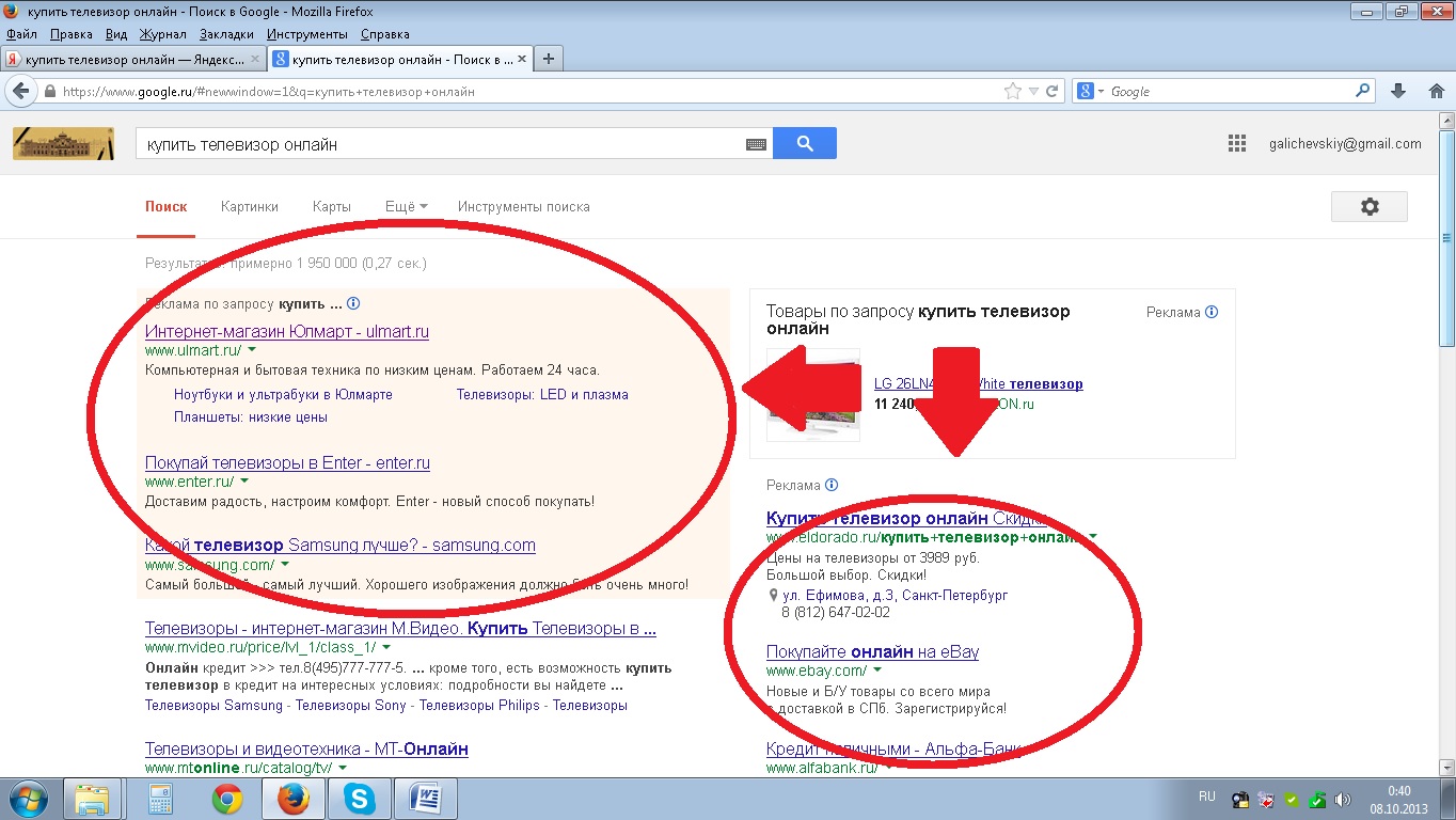 Ниже приведен пример (рис. 23) контекстной рекламы из поисковой системы Гугл для запроса «купить телевизор онлайн». Стрелками и красными кругами обозначены области контекстной рекламы; все, что не вошло в эти области, является обычной выдачей самой поисковой машины.