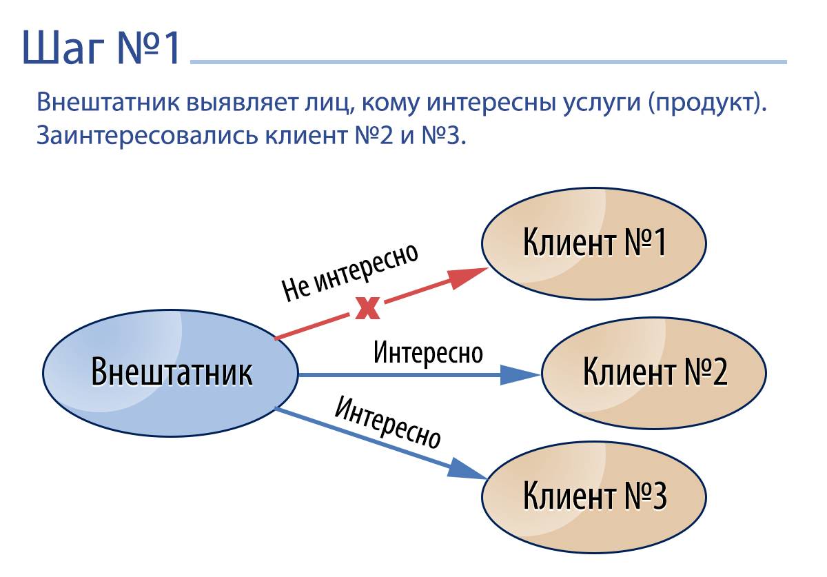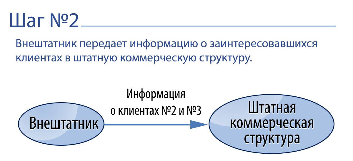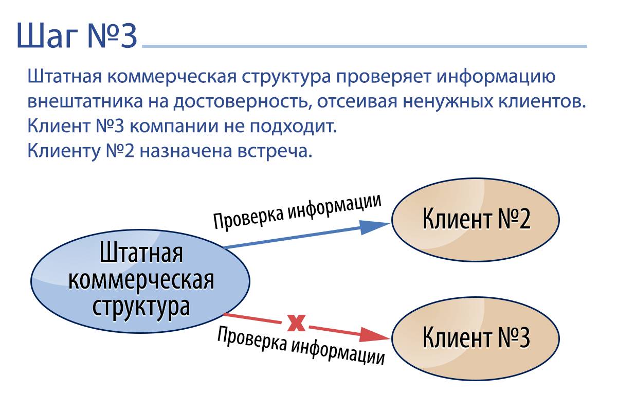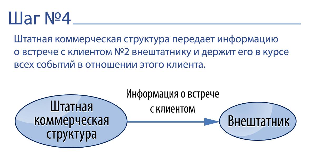 Внештатник выявляет интерес потенциального клиента к продукту и получает от него принципиальное согласие на встречу. Затем эту информацию он передает в штатный коммерческий отдел компании лицу, за которым он закреплен. После этого ответственный штатный сотрудник связывается с потенциальным клиентом, перепроверяет всю информацию и обговаривает непосредственное место и время встречи. А далее информация о месте и времени встречи доводится до внештатного работника, чтобы он принял решение, хочет ли в ней учувствовать или нет.