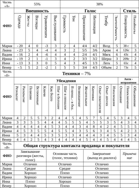 В части «А» ведущий проставляет оценки участникам за качество по овладению навыками считывания жестов и управления своим голосом. В части «Б» – оценки за способность выполнять ту или иную технику, способствующей продаже. В части «В» – оценки за умение синхронизировать полученные навыки.