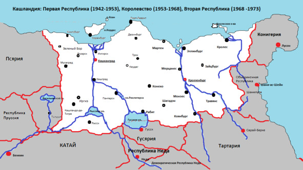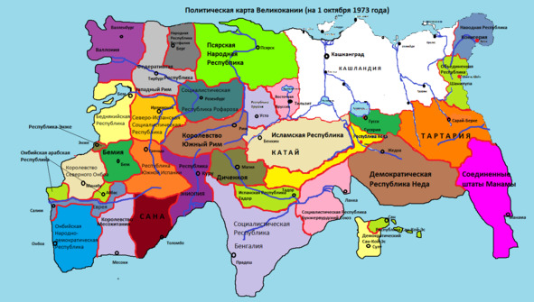 Мы придумали, что Великокания, вместившая около полусотни выдуманных стран, в прошлом подверглась колониальным притеснениям со стороны реальных Испании и Великобритании, Франции и Германии. Но к началу 70-х годов все её страны обрели независимость, существовали самостоятельно. Историческими соперниками и противниками Кашландии были Тартария, Гусярия и Пруссия. Они всегда посягали на нашу территорию, с ними в прошлом велись войны, а в настоящем – возникали конфликты и напряженности.