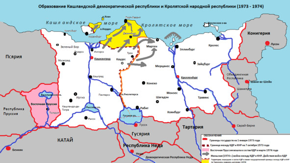 В марте 1974 года договор об объединении двух стран был подписан. Восточная Пруссия стала одним их штатов Кашландии, территория которой сразу же увеличилась, а население возросло после вероломного ухода Кролятии. Кстати, в договоре указывалось, что новый штат сохраняет широкую автономию, в нём применяется местный язык, традиции, православная религия. На его территории не могут действовать общекашландские партии. Даже пост президента этого внутреннего государства был сохранён, чего в других штатах, конечно же, не было. Договор об объединении провозглашался неотъемлемой частью Конституции Кашландии, и должен быть включён в неё при разработке.