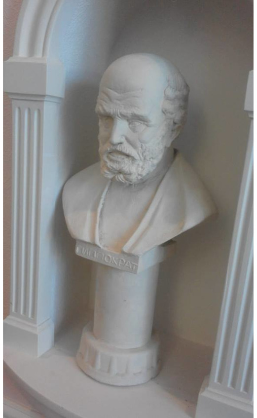Вечером того же дня два здоровенных мешка «красовались» в коридоре нашей хрущёвки, совершенно блокируя всяческое движение в квартире. Мне был дан двухнедельный «творческий отпуск» для ваяния с освобождением от занятий по ОЗ. Можете представить, во что превратились «апартаменты» в результате творческого процесса… Меловые тропинки были от прихожей до ванной комнаты и далее по всей квартире. Тут необходимо отметить, что из гипса не лепят, им льют, а поскольку требовался бюст практически 1:1 по отношению к человеческому росту, такого количества пластичного материала для создания бюста и последующего отлития гипсовой формы у меня не было, пришлось изобретать. Недолго думая, я взял 2-х литровую банку от сока, засунул её в большую банку от тушенки, скрепив лейкопластырем, стал пытаться лепить. Три дня напролёт я промучился только с созданием болванки бюста, порой доходя до отчаяния, то и дело, впадая в творческий кризис. Но мы не привыкли отступать. К концу третьего дня у меня стало вырисовываться очертание формы головы и постамента. Кто сталкивался с гипсом, конечно, знает, что при смешивании с водой, последний быстро переходит в твердую кристаллическую форму с образованием кристаллогидрата гипса. Поэтому, лепить из него невозможно, и я пошел по другому пути. Отлив массивную болванку, я стал попросту отсекать ненужное, ровно так, если бы пришлось работать с деревом или камнем. В общем, аккурат к концу второй недели, «сваяв» Гиппократа, я вдруг обнаружил, что бюст практически неподъёмный! Еще бы, на это «творение» аккурат и ушло около 100 кг чистейшего дорогого стоматологического материала, ну, конечно с учётом полов и напрочь забитого стояка… Да, сзади не забыл приделать отлитый из того же материала табличку с фамилией и инициалами мастера-изготовителя.