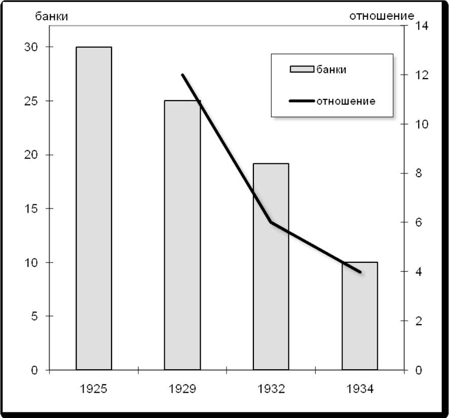 У. Черчилль[58]Старт валу банкротства банков дал тот же кризис 1921 г. Великая депрессия, вызвав массовое разорение вкладчиков, лишь углубила процесс. «Где была Федеральная резервная система (ФРС), пока происходили все эти события? – задавался вопросом П. Бернстайн. Известные экономисты М. Фридмен и А. Шварц дают ответ на этот вопрос в своей монументальной монетарной истории Соединенных Штатов: «Система была деморализована, и ее охватила общая паника, которая распространилась в финансовых кругах и в обществе в целом. Независимая центральная банковская система, призванная воздействовать на рынок, казалось, не подавала никаких признаков жизни»[59].