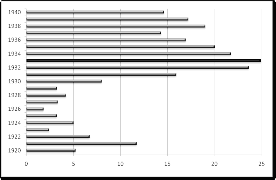 В 1931 г. последовал очередной удар, за короткое время европейские банки, большей частью французские и швейцарские, напуганные кризисом, забрали со своих вкладов в США 755 млн. долл. золотом[60]. Поднятая волна паники привела к изъятию американцами золотых монет, после чего сразу обанкротились почти 800 банков[61]. ФРС не теряя времени, более чем вдвое повысила дисконтную ставку с 1,5 до 3,5 %. Отток золота сразу сократился. Однако повышение ставки вызвало новую волну снижения производства и роста безработицы.
