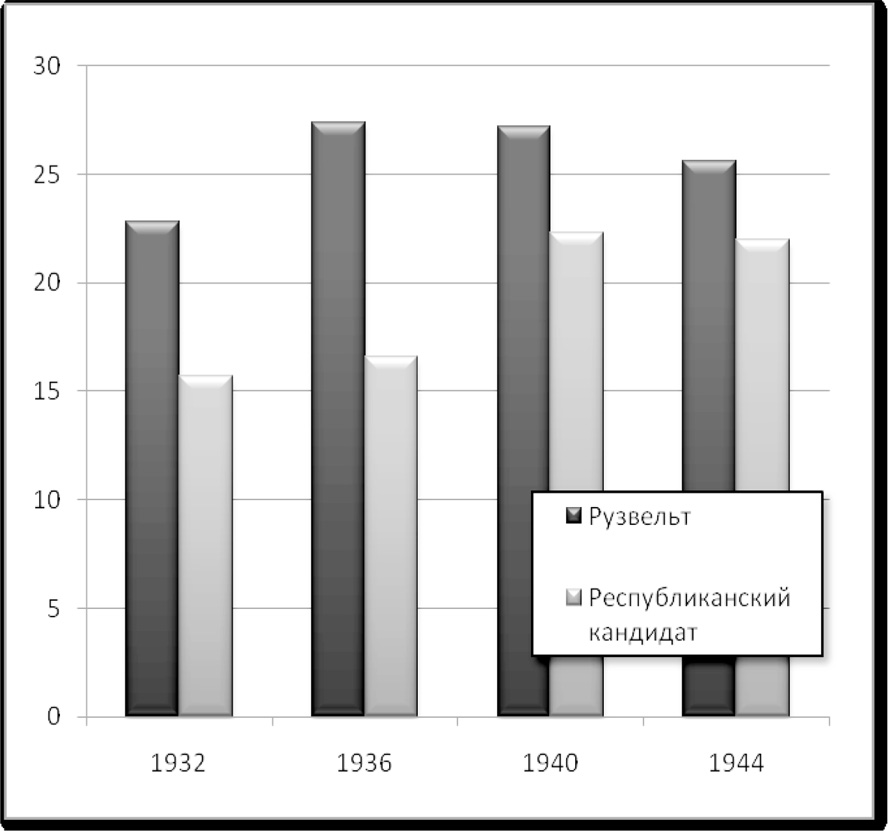 Ф. Рузвельт одержал убедительную победу на выборах, за него отдали голоса 23 млн. избирателей и 472 выборщика, Г. Гуверу удалось получить 16 млн. голосов и только 59 выборщиков. Демократы завоевали уверенное большинство и в обеих палатах Конгресса. В своей инаугурационной речи Рузвельт заявил: «Я испрошу у Конгресса самые широкие полномочия, что бы начать войну с несчастьем, я испрошу такие полномочия, как если бы на нас напал внешний враг». Виновниками тяжелого положения в стране президент назвал «некомпетентных банкиров и неразборчивых в средствах ростовщиков»[110]. Так началась эпоха Ф.Д. Рузвельта, продолжавшаяся почти 12 лет.