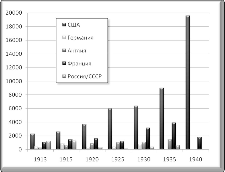 «Ветер войны» пришел в Америку с потоком золота, хлынувшим из Европы, уже чувствовавшей дыхание приближающихся испытаний[279]. Современные экономисты Ф. Грэм и Ч. Уиттлси назвали происходившее «золотой лавиной». С 1900 по 1913 гг. в США запас монетарного золота рос в среднем примерно на 70 млн. долларов в год[280]. С 1934 по 1939 г., минимальный прирост американского золотого запаса составил 1100 млн. долларов в год[281]. К началу Второй мировой, около 60 % всего мирового запаса монетарного золота, находились в США (в 1929 г. – 38, в 1913 г. – 23 %)[282]. Американский минфин был даже вынужден «тормозить приток золота», во избежание чрезмерного усиления доллара[283].