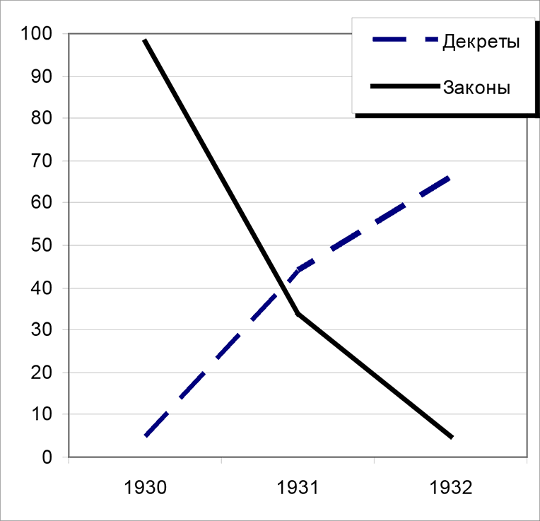 Экономический кризис привел к политическому, и начиная с 1930 г. Германия, на основании ст. 48 Веймарской конституции, почти все время управлялась посредством президентских декретов. Число декретов по мере обострения кризиса увеличивалось, а число принятых рейхстагом законов уменьшалась. Неизбежным результатом таких методов управления стало все большее ограничение и выхолащивание парламентского режима.