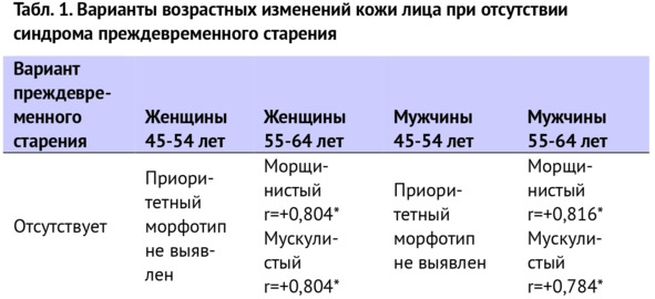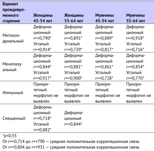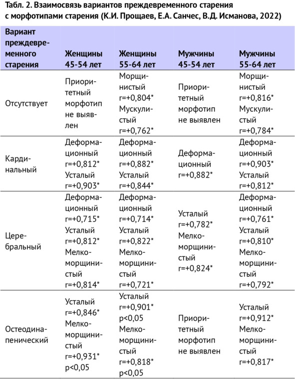 При наличии синдрома преждевременного старения отмечается четко выраженная взаимосвязь с определенными морфотипами старения (К. И. Прощаев, Е. А. Санчес, В. Д. Исманова, 2022) (табл. 2).
