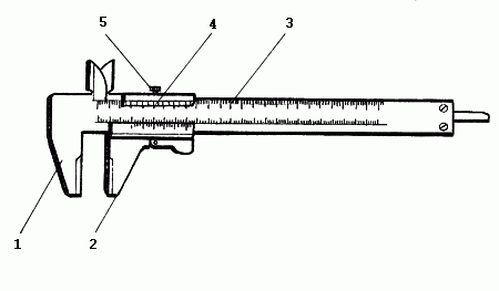 Рис. 13. Штангенциркуль: 1 – измерительные губки; 2 – рамка; 3 – штанга; 4 – нониус; 5 – стопорный винт