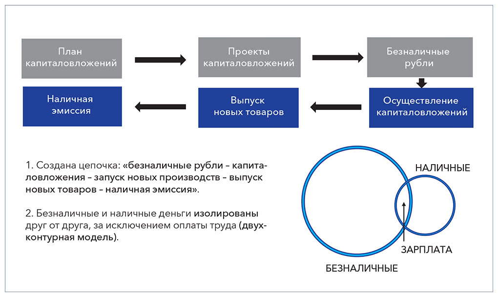 Выводы: таким образом, двухконтурная денежная модель становится важнейшим элементом экономической системы и фактором высокого роста экономики, а сама система управления развитием экономикой усваивает следующие ключевые принципы.