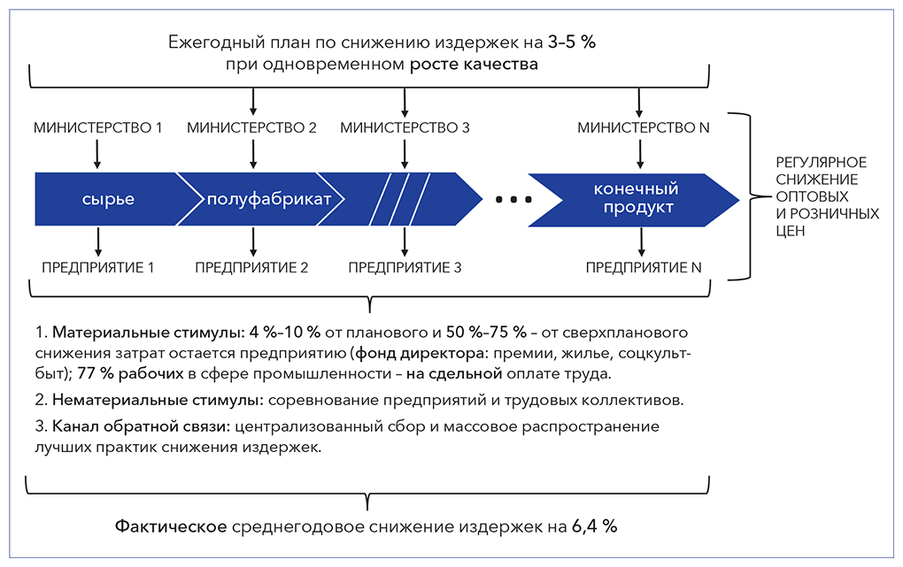 В результате государством организуется целевое, фронтальное повышение производительности труда во всех отраслях экономики. Ежегодно устанавливается плановое задание по увеличению производительности труда – ежегодно централизованно увеличиваются нормы выработки продукции на одного работника. При этом активно внедряются материальные стимулы, развивается конкуренция, непрерывно выявляются и массово распространяются лучшие практики бережливого производства. В итоге это позволяет выйти на траекторию постоянного роста производительности труда.