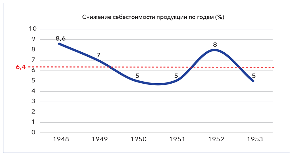 Задания по снижению затрат формируются, начиная с первого пятилетнего плана. Григорий Федорович Гринько пишет: «Уже в первом году проектируемой пятилетки снижение себестоимости промышленной продукции стало центральной проблемой хозяйственных планов и хозяйственной деятельности. Борьба за снижение себестоимости промышленной продукции стала в центре внимания не только производственных кадров промышленности, но и в центре внимания всей общественной жизни страны»{303}.