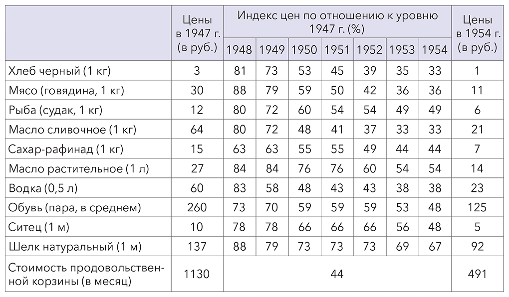 В целом стоимость продуктовой корзины дешевеет за 8 лет (1947–1954 год) с 1130 рублей до 491 рубля, то есть в 2,3 раза, при этом хлеб, масло и мясо дешевеют в 3 раза.