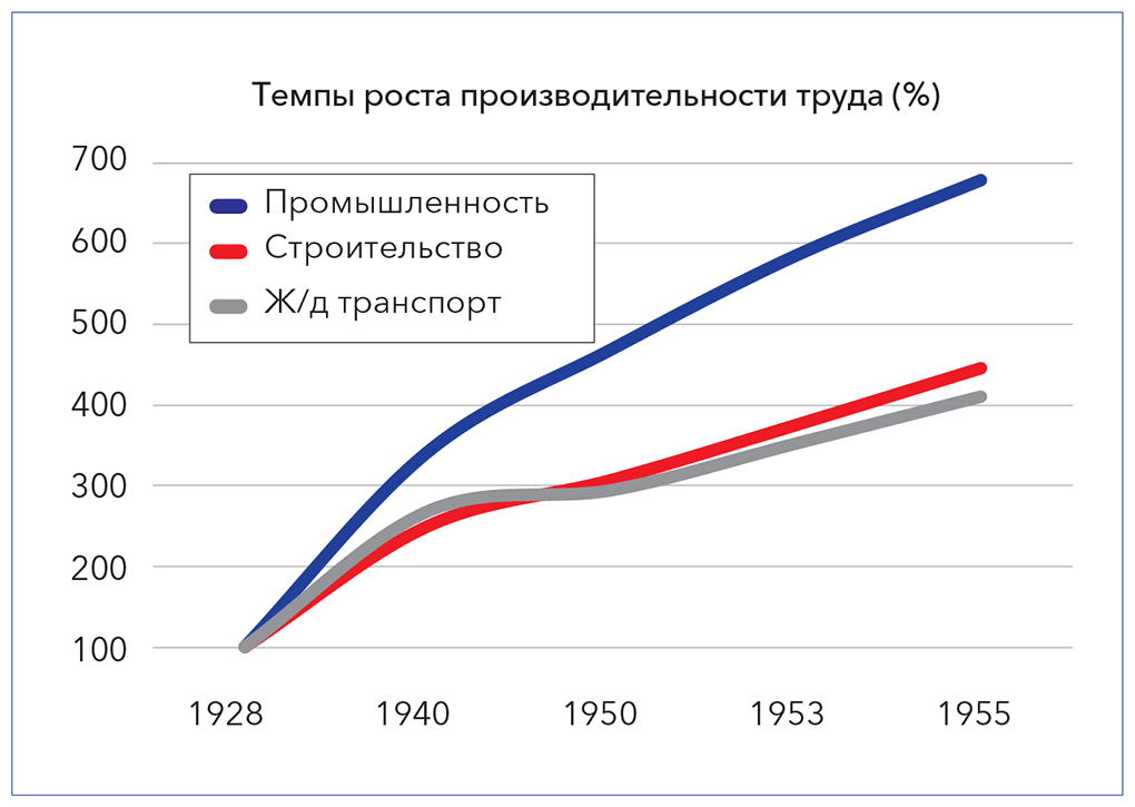 Темпы роста производительности труда в период с 1928 по 1955 год приведены на Рис. 57.