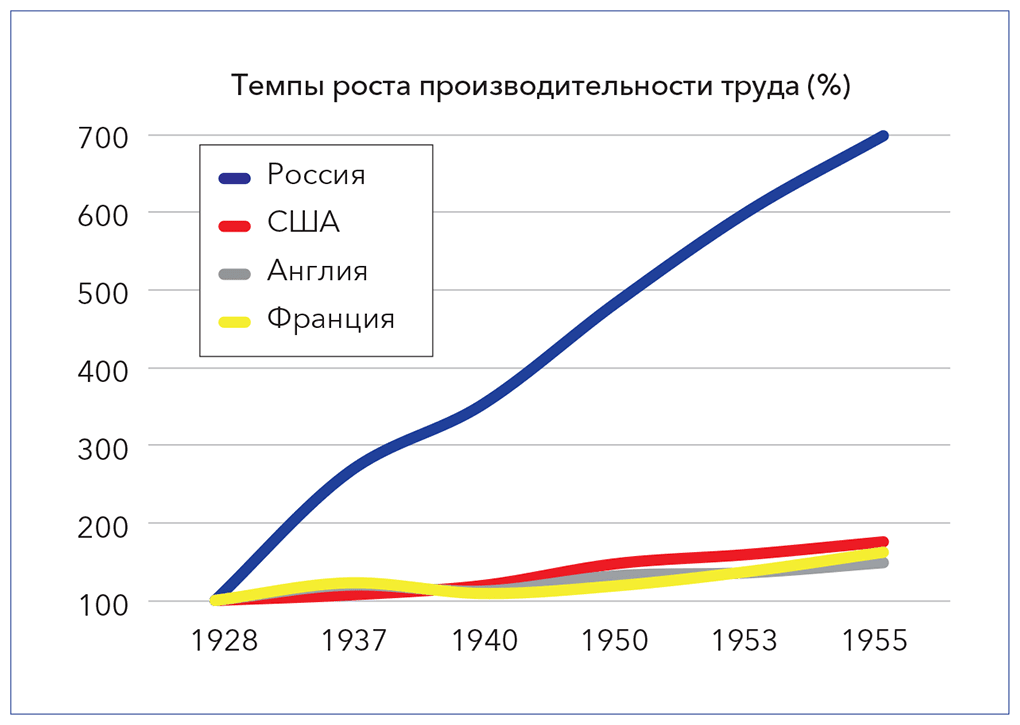 В целом к середине 1950-х экономика России по уровню производительности труда в промышленности выходит на первое место в Европе и второе место в мире, опережая экономики Англии, Франции и кратно сокращая отставание от экономики США с 9 раз в 1913 году до 2 раз – к концу 1950-х годов{320}.