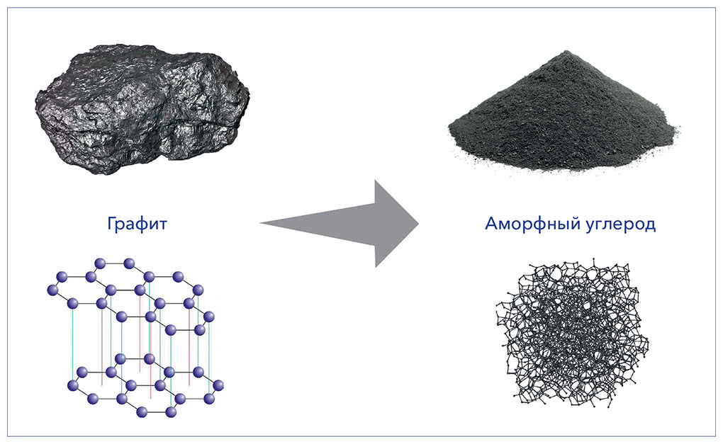 Рис. 76. Кристаллические решетки и внешний вид графита и аморфного углерода