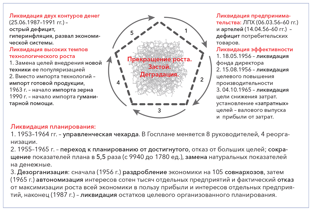 1. Ликвидация планирования, включая утрату идеи, цели, стратегии развития, раздробление экономики, автономизацию предприятий, переход к планированию от достигнутого, радикальное снижение количества плановых показателей, отказ от натуральных показателей плана в пользу денежных, разрушение канала обратной связи в экономике, приводит к кардинальному падению организованности экономической системы – соответствующему падению темпов роста и хаотизации экономики.
