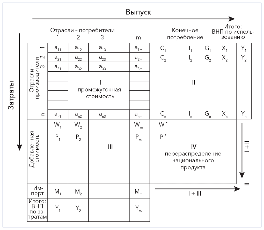 При составлении межотраслевого баланса разделяются объемы товаров для конечных потребителей и продукция, выпускаемая для внутреннего потребления отраслями. Таким образом, «совокупный выпуск всех отраслей складывается из двух компонент – выпуска для конечного потребления и выпуска для межотраслевого потребления (для обеспечения производства продукции других отраслей)»{109}.