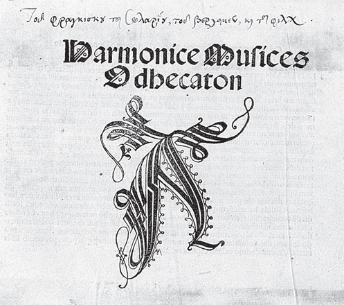 Титульный лист первого нотопечатного сборника Оттавиано Петруччи “Одекатон” (Венеция, 1501).