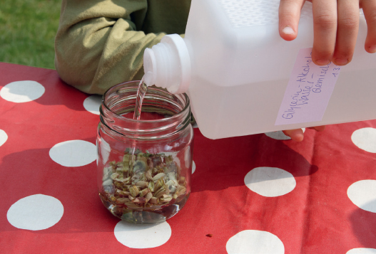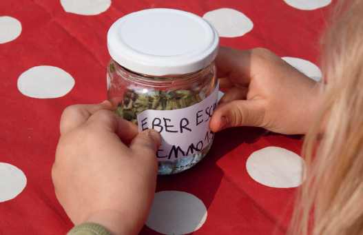 5. Das Glas wird mit Pflanzennamen und Datum beschriftet. Dann lässt man den Inhalt drei bis vier Wochen bei täglichem Schwenken beziehungsweise Wenden (nicht Schütteln!) ausziehen. Dabei können die Kinder mit einbezogen werden: Sie mögen solche täglichen Rituale und können damit einen direkten Kontakt zum Heilmittel aufbauen.