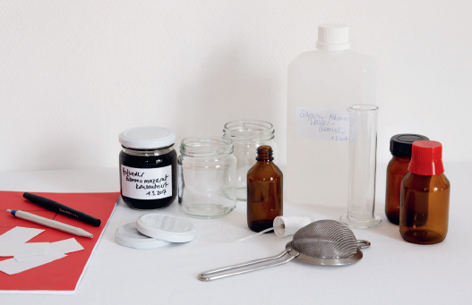 • Glas zum Aufbewahren. Traditionell wird dafür Braunglas verwendet, damit das Pflanzengut lichtgeschützt ist. Sie können aber auch normale Marmeladengläser mit Papier oder Stoff umwickeln, sodass der Inhalt vor UV-Strahlung geschützt wird. Wichtig ist, dass die Marmeladengläser gründlich ausgewaschen und frei von Gerüchen sind. (Nicht geeignet sind Gläser von Senf, Essiggurken.)