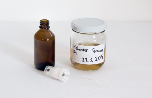 11. Auch die Sprühflasche wird mit Pflanzennamen, der Bezeichnung D1 und dem Datum beschriftet. Das Gemmomazerat ist nun gebrauchsfertig. Das restliche, unverdünnte Knospenmazerat im Glas wird mit Papier oder Stoff vor Licht geschützt und kühl aufbewahrt (am besten in den Keller stellen). Die selbst hergestellten Gemmomazerate haben bei richtiger Lagerung eine Haltbarkeit von mindestens drei Jahren.