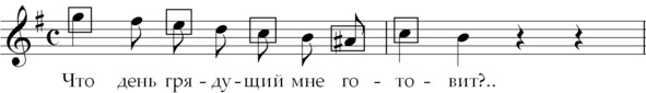 Кроме вертикального изложения Чайковский пользовался и горизонтальным вариантом изложения фатум-аккорда11. Например, по звукам этого аккорда троекратно строится мелодия в Арии Ленского на словах: «Что день грядущий мне готовит?», «Паду ли я, стрелой пронзенный», «Придешь ли, дева красоты» (см. Пример 2).