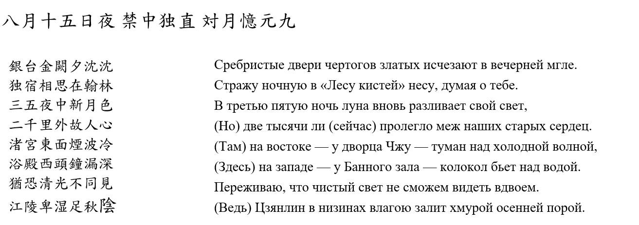 В оригинале играют и переливаются серебряные и золотые блики, подобно отсвету дворцов бессмертных на священных горах, льется свет луны подобно воде. Погружению в глубокие воды подобен величественный вид дворцовых ворот, около которых расположена академия Ханьлинь («Лес кистей»), и все это в воображении поэта перекликается с туманом над волнами, омывающими «дворец на востоке», куда сослан его близкий друг, отзывается боем колокола при водяных часах, отмеривающих быстротечное время в императорском зале Омовений, там, где остался Бай Цзю-И.