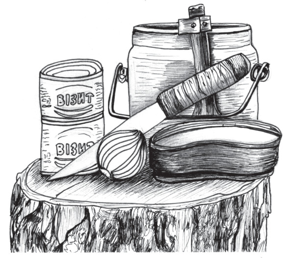 Перед нашими визави на ящике из-под гранат стояли две открытые банки с тушенкой и котелок. Мы их застали перед трапезой.