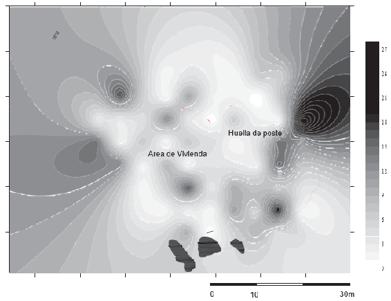 comprobar que hacia el centro del sitio (la parte más plana) el horizonte cultu- ral es menos profundo (35 a 50 cm), en tanto que hacia los bordes de la colina fue posible encontrar horizontes culturales de hasta de 85 cm de profundidad. Esta información es consecuente con un modelo típico de habitación, donde la parte plana central fue el lugar donde se erigió la vivienda y hacia los ex- tremos se depositó el material producto de la limpieza de la misma. Esto, a su vez, fue confirmado por un sondeo situado justo en la mitad de la zona plana y en el que se detectó una huella de poste. El análisis de la distribución de la cerámica dio como resultado un típico anillo de desechos de cerámica, tal y como ha sido documentado por diferentes autores como correlato de áreas de habitación (Boada, 2007; González, 2007; Henderson y Ostler, 2005; Jaramillo, 1996; Obregón, 2008; Romano, 2003a), y en el cual hacia los bordes de la