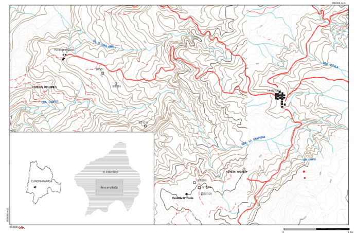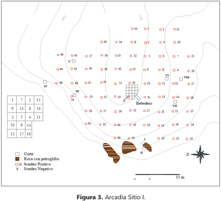 1 Hallazgo de rocas con arte rupestre; 2. Selección de aquellas que presentan a su alrededor áreas a) no profundamente alteradas por vandalismo u otras actividades antrópicas (cultivos o infraestructura) y b) con pendientes no tan pronunciadas como para que el material arqueológico (en caso de que lo hubiese) se haya desplazado; 3. Presencia de material arqueológico evidenciada mediante pequeños pozos de sondeo en inmediaciones de las rocas; 4. Posibilidad de realización de excavaciones arqueológicas (permiso delpropietario, facilidadlogística, etc.). Enla Finca La Florida(vereda Arcadia) y la parte media de la Hacienda Misiones (vereda Misiones) se identificaron sitios que cumplieron los requerimientos antes mencionados (Figura 2). Entre los años 2007 a 2009 se organizaron diferentes temporadas de campo, con la ejecucßión de los trabajos arqueológicos descritos a continuación.