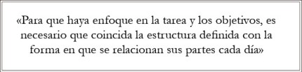 Un día pasó algo muy curioso. Teníamos reunión con el equipo directivo y dibujamos en la pizarra el organigrama deseado, olvidando borrarlo. Ese mismo día se reunió todo el equipo (incluido la persona ascendida y sus compañeros) en la sala, asumiendo con normalidad lo que allí había dibujado, ya que era un secreto a voces. Desde ese día se respiró un aire más ligero, y el equipo fue integrando la nueva estructura, pero sobre todo comenzó a percibirse coherencia entre lo definido y la forma de actuación.