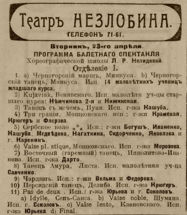 «ТЕАТР» № 1272 от 23-24 апреля 1913 года. Театр Незлобина. Программа балетного спектакля Хореографической школы Л.Р. Нелидовой. Kujawiak Венявского (польский народный танец – прим. автора) исполняют малолетние ученицы старшего курса: Немчинова 2-я и Нижинская.