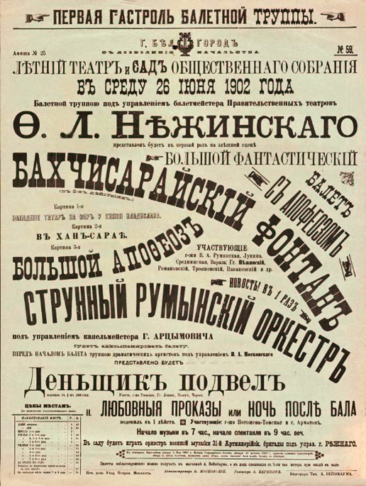 Афиша. Премьера фантастического балета «Бахчисарайский фонтан». Балетная труппа под управлением балетмейстера Правительственных театров Ф.Л. Нижинского. Летний театр и сад общественного собрания. Город Белгород. 26 июня 1902 года