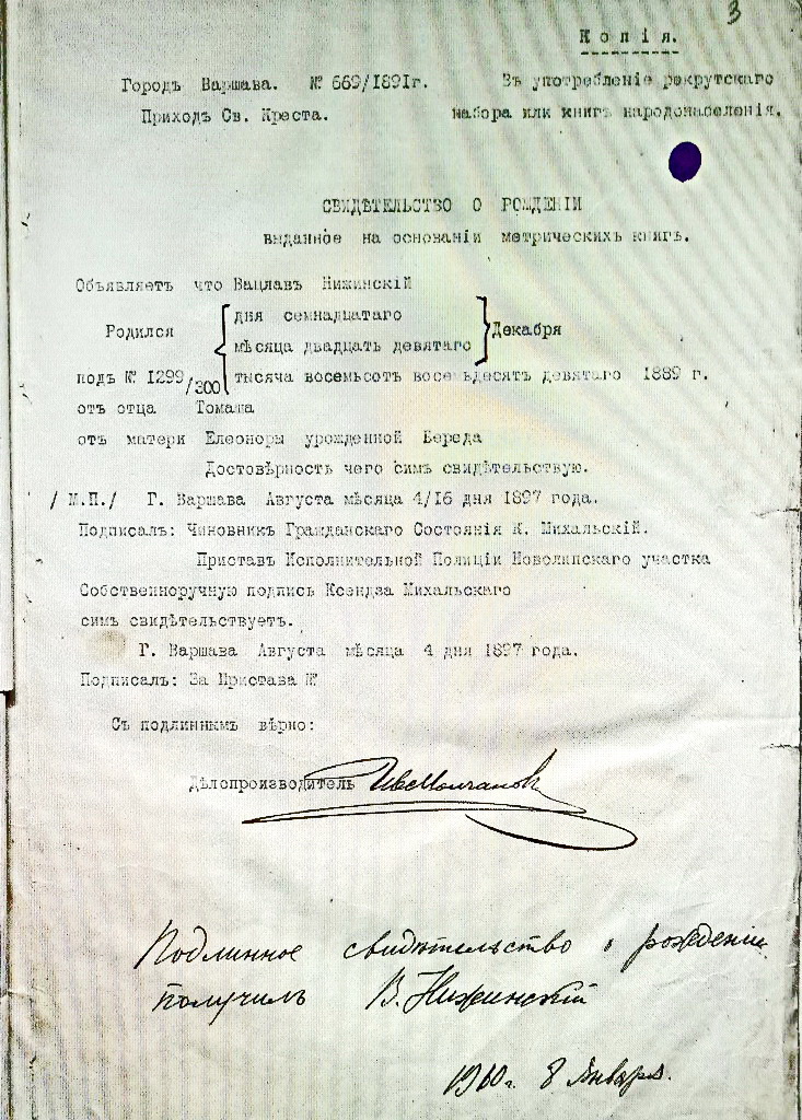 Но вот копия Свидетельства (№669/1891 г., город Варшава, приход Св. Креста) о рождении Вацлава Нижинского, выданное на основе метрических книг. Копия выдана 4 (16) августа 1897 года. В этом документе, официальной датой его рождения является 17 (29) декабря 1889 года, а место рождения – Варшава. Как же так?