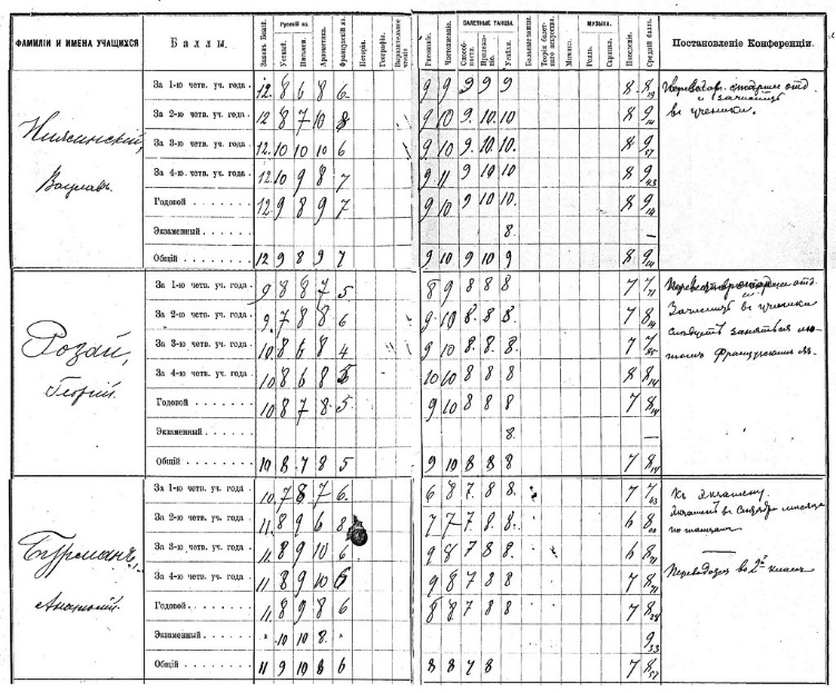 Школьные ведомости учащихся В. Нижинского, Г. Розая и А. Бурмана за 1898/99 испытательный учебный год. Копия из личного архива автора. Публикуется впервые. (Источник: РГИА Фонд № 498 опись № 1 дело № 6732)