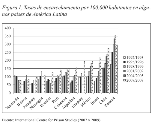 Por mencionar dos ejemplos representativos con respecto al crimen, de acuerdo con la Oficina de las Naciones Unidas contra la Droga y el Delito (UNODC), entre 1989 y 1999 Latinoamérica presentó los mayores niveles de victimización en el mundo: más del 75% de las personas que vivía en ciudades fue víctima del crimen al menos una vez, comparado con un 73% en África y un 60% en Europa occidental (UNODC 1999: 26, 64). Entre 1980 y 1995 la región sufrió un incremento generalizado de las tasas de homicidio (aunque con importantes diferencias entre países), lo que la convirtió en la zona más violenta del mundo en 1995, con un promedio de 20 homicidios por 100.000 habitantes (Ibíd). En cuanto a la tasa de encarcelamiento, ésta aumentó en promedio un 68% durante la última década (Ariza 2010) (véase Figura 1).