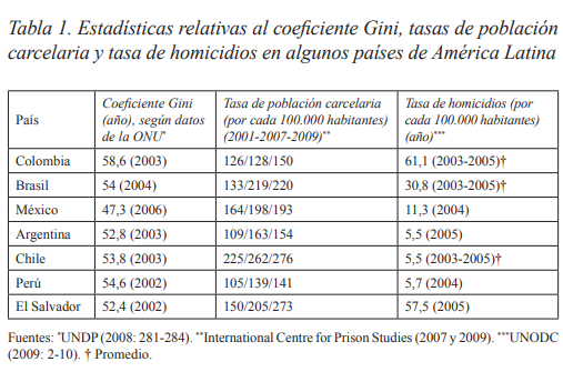 La forma en que muchos países latinoamericanos han adoptado el modelo neoliberal es crucial para explicar la actual configuración de sus sistemas penales y sus respuestas frente al crimen. Chile, El Salvador, México, Colombia e incluso Brasil y Argentina son ejemplos de ello: tienen una economía política de tendencia neoliberal, presentan altos índices de inequidad, altas tasas de homicidios (aunque con notables variaciones entre ellos) y altas tasas de encarcelamiento bajo estándares internacionales (ver Tabla 1).