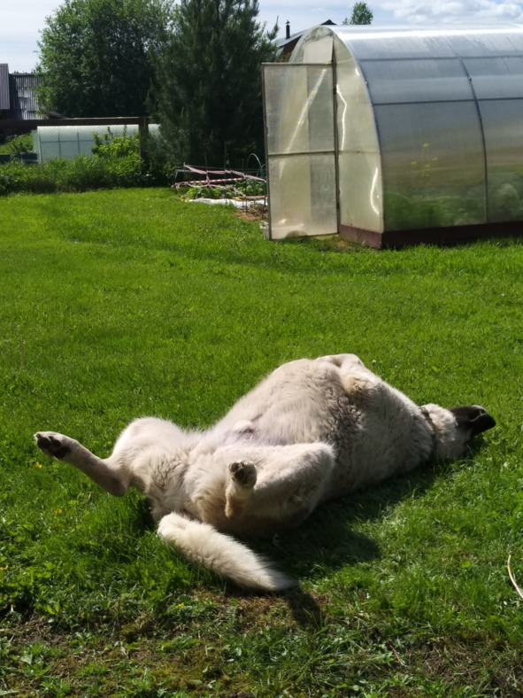 Валяемся с мелким на траве, просто так от нечего делать… у него такое горячее дыхание, ну и пасть большая, которая располагается постоянно в пару сантиметрах от моего юношеского лица (ахаха тридцатилетнего)
