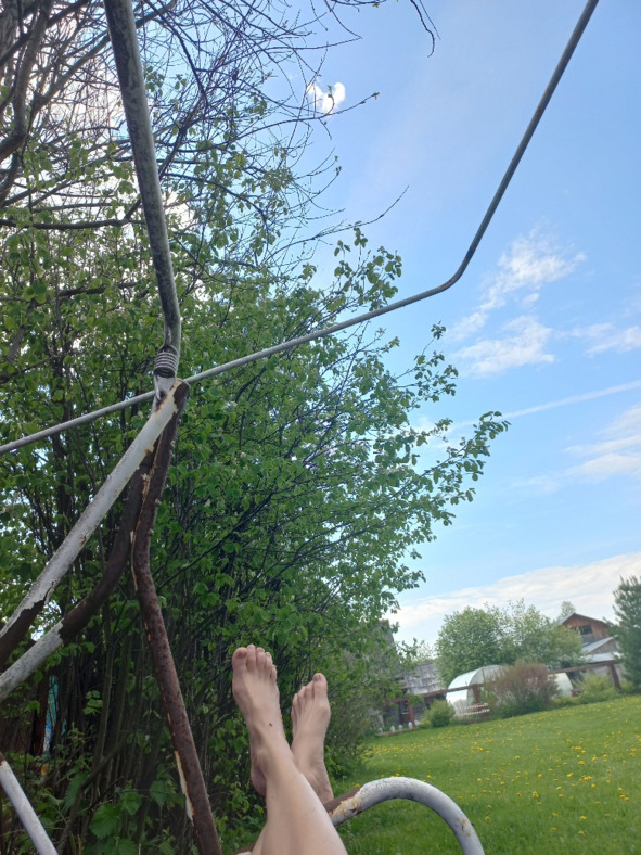 Устали мы с ребятами от жары… на удивление… потому на качели – в тени – это лучшее решение.