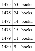 In 1474 the names of the printers entirely disappear as partners. Sweynheym is known to have died before 1478 (when the Ptolemy, which he had begun to prepare for the press, was published by Arnold Buckingk), but at what particular time is uncertain. Pannartz comes forward by himself in December 1474, and in the following year he occurs as the printer of eight books, chiefly classical. In 1476 he prints three, but his activity abruptly terminates in March, a period coinciding with a collapse in Roman publishing, best illustrated by a comparative table: —