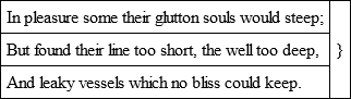 ‘Thus long have I, by native mercy sway’d,My wrongs dissembled, my revenge delay’d;So willing to forgive the offending age,So much the father did the king assuage.But now so far my clemency they slight,The offenders question my forgiving right.That one was made for many, they contend;But ’tis to rule; for that’s a monarch’s end.They call my tenderness of blood, my fear;Though manly tempers can the longest bear.Yet since they will divert my native course,’Tis time to shew I am not good by force.Those heap’d affronts, that haughty subjects bring,Are burdens for a camel, not a king.Kings are the public pillars of the state,Born to sustain and prop the nation’s weight:If my young Sampson will pretend a callTo shake the column, let him share the fall.But oh, that he yet would repent and live!How easy ’tis for parents to forgive!With how few tears a pardon might be wonFrom nature pleading for a darling son!Poor, pitied youth, by my paternal careRaised up to all the height his frame could bear!Had God ordain’d his fate for empire born,He would have given his soul another turn:Gull’d with a patriot’s name, whose modern senseIs one that would by law supplant his prince;The people’s brave, the politician’s tool;Never was patriot yet, but was a fool.Whence comes it, that religion and the lawsShould more be Absolom’s than David’s cause?His old instructor, ere he lost his place,Was never thought endued with so much grace.Good heavens, how faction can a patriot paint!My rebel ever proves my people’s saint.Would they impose an heir upon the throne?Let Sanhedrims be taught to give their own.A king’s at least a part of government;And mine as requisite as their consent.Without my leave a future king to choose,Infers a right the present to depose.True, they petition me to approve their choice;But Esau’s hands suit ill with Jacob’s voice.My pious subjects for my safety pray;Which to secure, they take my power away.From plots and treasons heaven preserve my years,And save me most from my petitioners!’It will be observed that ‘the right the present to depose,’ is mentioned by Dryden as something manifestly preposterous, and the derivation of it as a logical corollary from the Exclusion Bill is assumed to be a sufficient reductio ad absurdum of the latter. In the view of the majority of the nation, this was sound doctrine until the Revolution, which reduced Dryden’s poem from the rank of a powerful political manifesto to that of a brilliant exercise of fancy and dialectic. As such, it will never cease to please and to impress. The finest passages are, no doubt, those descriptive of character, whether carefully studied portraits or strokes against particular foibles imputed to the poet’s adversaries, such as this mock apology for the parsimonious kitchen of the Whig sheriff, Slingsby Bethel: