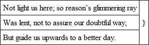 ‘Dim as the borrow’d beams of moon and starsTo lonely, weary, wandering travellers,Is reason to the soul: and as, on high,Those rolling fires discover but the sky,