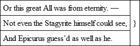 ‘True wit is nature to advantage drest;What oft was thought, but ne’er so well exprest.’At the same time the poetry hardly rises to the height which the theme might have justified. There is little to captivate or astonish, but perpetual admiration attends upon the masterly conduct of the argument, and the ease with which dry and difficult propositions melt and glide in harmonious verse. The execution is singularly equable; but perhaps hardly maintains the elevation of the fine exordium: