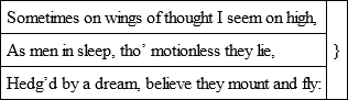 ‘’Tis endless, Sir, to tell the many waysWherein my poor deluded self I please:How, when the fancy lab’ring for a birth,With unfelt throes, brings its rude issue forth:How, after, when imperfect, shapeless thoughtIs, by the judgment, into fashion wrought:When at first search, I traverse o’er my mind,None, but a dark and empty void I find:Some little hints, at length, like sparks break thence,And glimm’ring thoughts, just dawning into sense:Confus’d, awhile, the mixt ideas lieWith nought of mark to be discover’d by;Like colours undistinguish’d in the night,Till the dusk images mov’d to the light,Teach the discerning faculty to choose,Which it had best adopt, and which refuse.Here rougher strokes, touch’d with a careless dash,Resemble the first setting of a face:There finish’d draughts in form more full appear,And in their justness ask no further care,Meanwhile, with inward joy, I proud am grown,To see the work successfully go on;And prize myself in a creating-power,That could make something, what was nought before.Sometimes a stiff unwieldy thought I meet,Which to my laws, will scarce be made submit:But when, after expense of pains and time,’Tis manag’d well, and taught to yoke in rhime,In triumph, more than joyful warriors would,Had they some stout and hardy foe subdu’d:And idly think, less goes to their command,That makes arm’d troops in well-placed order stand,Than to the conduct of my words, when theyMarch in due ranks, are set in just array.