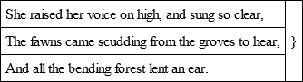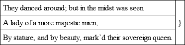 ‘Waller was smooth, but Dryden taught to joinThe varying verse, the full majestic line,The long-resounding march, and energy divine.’His changes, nevertheless, were not always improvements. He is too uniform, though not absolutely uniform, in confining the sense to the couplet; and, in adding dignity to Chaucer’s verse, he has lost something of its sweetness. Leigh Hunt well observes: ‘Though Dryden’s versification is noble, beautiful, and so complete of its kind that to an ear uninstructed in the metre of the old poet all comparison between the two in this respect seems out of the question and even ludicrous, yet the measure in which Dryden wrote not only originated, but attained to a considerable degree of its beauty in Chaucer; and the old poet’s immeasurable superiority in sentiment and imagination, not only to Dryden, but to all, up to a very late period, who have written in the same form of verse, left him in possession of beauties, even in versification, which it remains for some future poet to amalgamate with Dryden’s in a manner worthy of both, and so carry England’s noble heroic rhyme to its pitch of perfection.’ It need not be said that Pope’s magnificent eulogy solely respects Dryden as a rhyming poet. His blank verse, though in general good enough for the stage, and better than that of most of his contemporaries, is utterly destitute of the sweetness and variety of the Elizabethans.