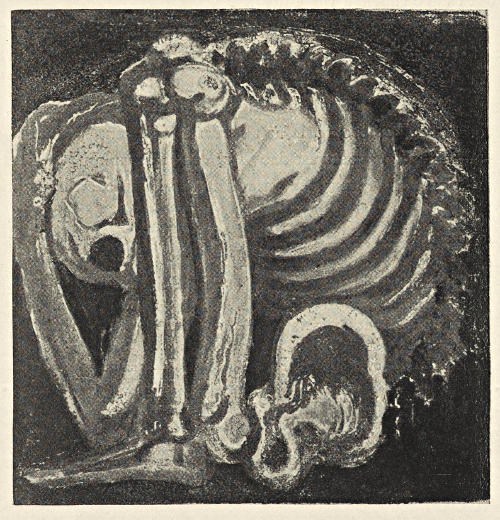 Blake’s technical defects are indicated by Messrs. Ellis and Yeats as consisting mainly in imperfect treatment of the human form from want of anatomical knowledge. He had always disliked that close study of the life which alone could have made him an able draughtsman; it “obliterated” him, he said, and had resolved to quarrel with almost all the artists from whom he might have learned. It must be remembered in his excuse that consummate colouring and consummate draughtsmanship are seldom found associated. Those who may feel disappointed with the reproductions of Blake’s mystical designs must also remember that these are but shadows of the artist’s thought, which needed for its full effect the application of colour by his own hand. “Much,” says Dante Rossetti, “which seems unaccountably rugged and incomplete is softened by the sweet, liquid, rainbow tints of the coloured copies into mysterious brilliancy.” The effect thus obtained may perhaps be best shown by Mr. Gilchrist’s eloquent description of the illuminated drawings in Lord Crewe’s copy of America. “Turning over the leaves, it is sometimes like an increase of daylight in the retina, so fair and open is the effect of particular pages. The skies of sapphire, or gold, rayed with hues of sunset, against which stand out leaf or blossom, or pendent branch, gay with bright-plumaged birds; the strips of emerald sward below, gemmed with flower and lizard, and enamelled snake, refresh the eye continually. Some of the illustrations are of a more sombre kind. There is one in which a little corpse, white as snow, lies gleaming on the floor of a green over-arching cave, which close inspection proves to be a field of wheat, whose slender interlacing stalks, bowed by the full ear and by a gentle breeze, bend over the dead infant. The delicate network of stalks, which is carried up one side of the page, the main picture being at the bottom, and the subdued yet vivid green light shed over the whole, produce a lovely decorative effect. Decorative effect is, in fact, never lost sight of, even where the motive of the design is ghastly or terrible.” Whatever the imperfections of Blake’s peculiar sphere, it was his sphere, and probably the only department of art in which he could have obtained greatness even if his technical accomplishment had been as complete as it was the reverse. When painting on more orthodox lines he is often surprisingly tame and conventional. How remote he was from the inane when he could revel in his own conceptions may, notwithstanding the tremendous disadvantages inherent in reproduction, be judged from the illustrations to his mystical books selected for this monograph, the frontispiece and Plate IV. of Thel, and the two subjects from America.