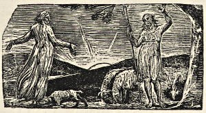 In 1821 Blake had performed another work of moment, his first and last wood-engravings. These were to illustrate Phillips’s imitation of Virgil’s first pastoral, republished by Dr. Thornton, a physician and botanist. Blake was a novice in this branch of art, and the cuts answer to Dr. Thornton’s own description of them: “They display less of art than of genius.” But nothing could more effectually confirm the principle enunciated by their critic in the Athenæum: “Amid all drawbacks there exists a power in the work of the man of genius which no one but himself can utter fully.” Rude as they are, their force is extraordinary; few things can be more truly magical than the glimpse of distant sea in the second of those engraved by Gilchrist. At the same time they are not in the least Virgilian, and in this respect form an instructive contrast with the exquisite though unfinished Virgilian illustrations of Samuel Palmer. Palmer, though putting in a cypress now and then as a tribute to couleur locale, provides Virgil substantially with the same style of illustration as he had been producing all his life for other ends, and yet this seems as appropriate to the text as Blake’s is discrepant. It is interesting to speculate what effect an Italian residence of two or three years, such as Palmer had enjoyed, would have produced upon Blake beyond the inevitable one of dissipating his monstrous delusions about Italian artists. He would probably have gone chiefly with the view of studying Michael Angelo, but we suspect that the influences of Italian landscape would in the long run have proved fully as potent.