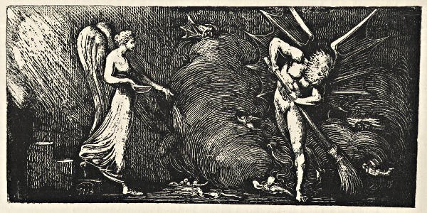Sparks spring out of the ground,Like golden sand scattered upon the darkness.Nor is the general tendency of art towards a world of purity, harmony, and joy unrepresented in him; sometimes this even seems the conclusion to which all else is merely subservient, as in the series of illustrations to Job, the ideal representation of his own history.